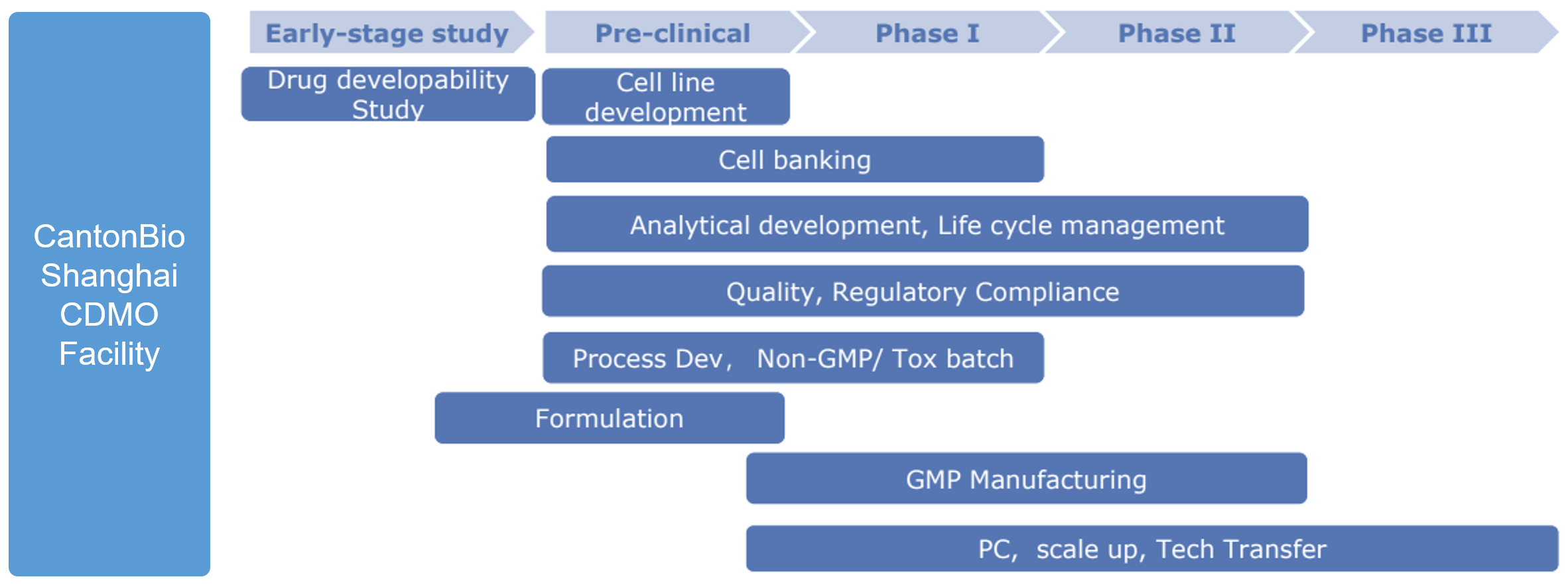 坐落于张江园区内的汉腾上海大分子CDMO 研发与生产基地(原某国际CDMO亚太区生物工艺开发和生产中心)占地3700m2,位于金科路张江药谷核心区,靠近中国最集中的生物医药产业集群。该中心原为此国际CDMO三大生物制药工艺开发中心之一,也是其在亚太区第一家能够为生物制药客户提供从细胞株构建直至药品临床前样品生产全线解决方案的实验基地,其服务涵盖:细胞株构建、上游/下游工艺开发、工艺放大及验证、分析方法开发及验证和药品临床样品生产。