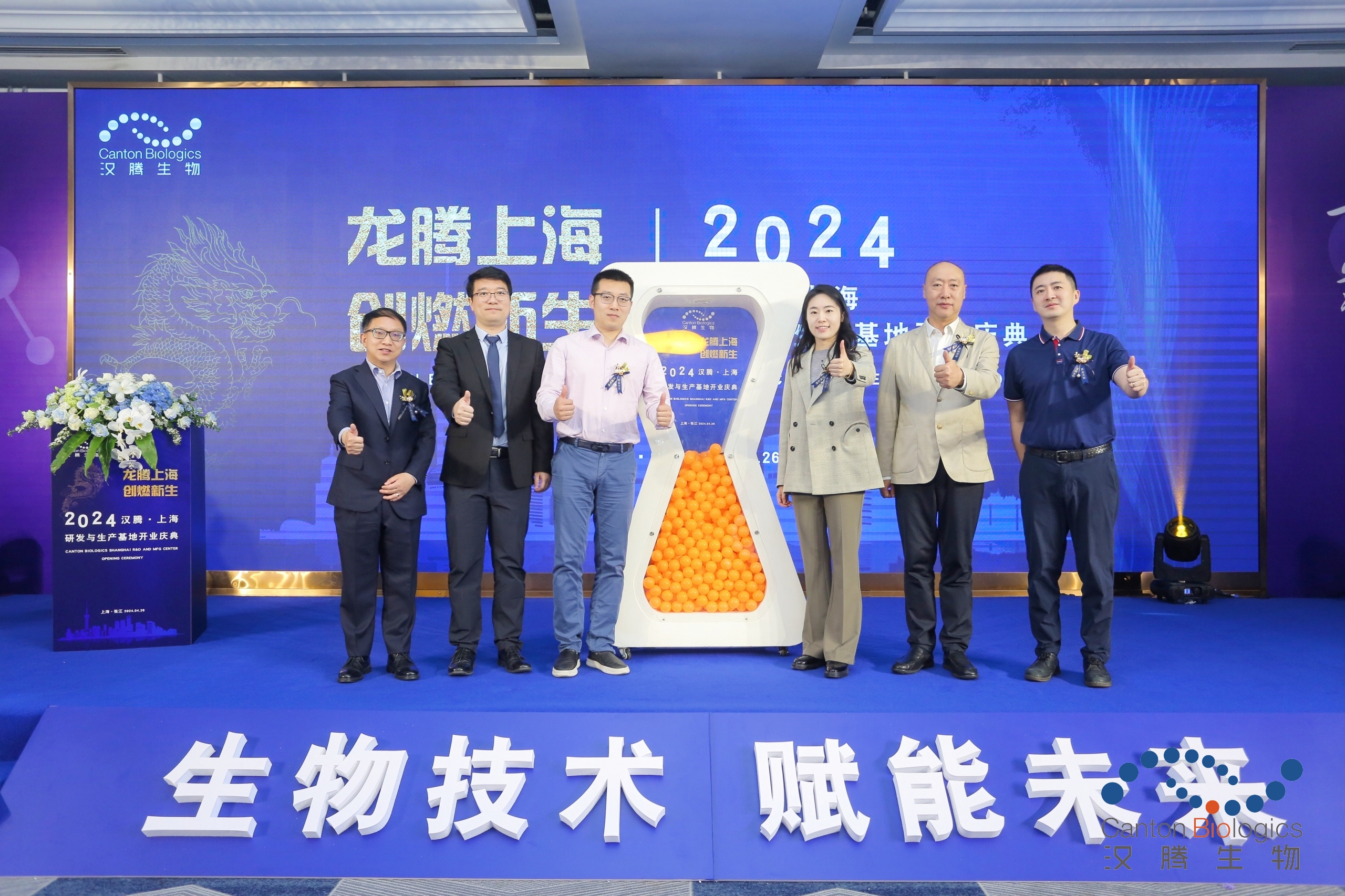演讲结束后,现场气氛达到高潮。在众人的热切期盼中,上海张江文控集团副总经理许颖女士、汉腾生物创始人、CEO 沈潇博士、汉腾生物联合首席执行官张春华先生、汉腾生物首席运营官高晓伟先生、执行副总裁温玄先生、默克生命科学工艺解决方案中国技术与科学解决方案总监王斌先生、汉腾生物高级商务副总裁刘嵩凯先生共同为上海研发与生产基地的开业启动仪式揭幕。随着嘉宾们手中的彩带缓缓拉开,代表着大分子的彩球奔涌不息,象征着汉腾生物商业版图逐步完善,CDMO业务蒸蒸日上,这一刻,汉腾上海研发与生产基地正式开业!这一盛举不仅标志着汉腾生物在生物医药领域迈出了坚实的步伐,更预示着企业未来的无限可能与辉煌成就。