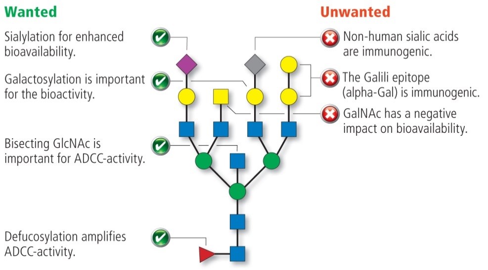 GlycoExpress® (GEX®)细胞系可赋予天然蛋白、抗体、融合蛋白等多种重组生物大分子蛋白复杂的人源糖基化特征,从而降低非人源糖基化特征的负面影响,满足复杂糖蛋白的临床开发需求。同时利用细胞工程、生物信息学、系统生物学及合成生物学技术,开发出SIALOMAX®、FUCOFLEX®、SIALOFLEX®三种专门针对唾液酸、岩藻糖和甘露糖修饰调节的细胞系,对于所表达的目标蛋白可达到延长半衰期、增强活性、增强ADCC效应等效果。